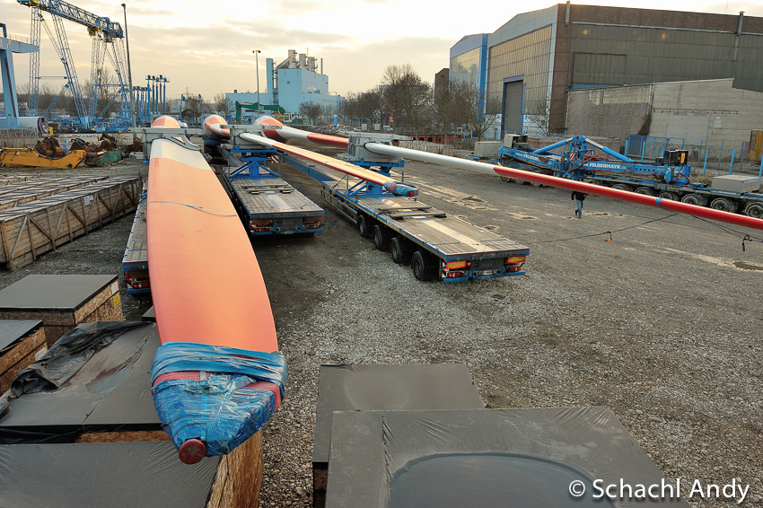 Erster Windflügeltransport der Firma Felbermayr vom Linzer Hafen über die Westautobahn nach Mondsee, weiter auf der Bundesstrasse nach Strasswalchen und dann zum Windpark Munderfing
