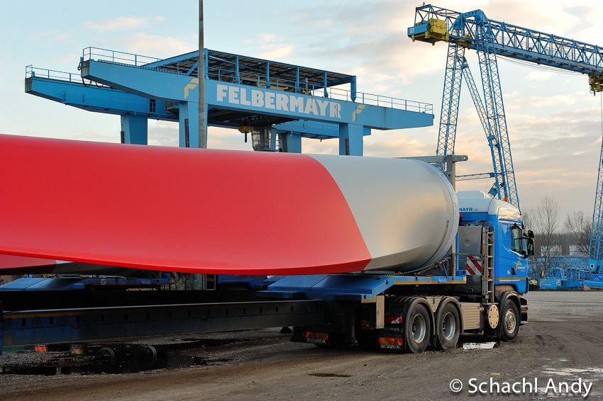 Erster Windflügeltransport der Firma Felbermayr vom Linzer Hafen über die Westautobahn nach Mondsee, weiter auf der Bundesstrasse nach Strasswalchen und dann zum Windpark Munderfing